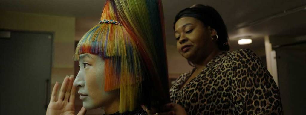 Shot in a number of extended unbroken takes, the camera feels like in animal in constant motion. We are somewhere that feels subterranean, a neon-lit basement of a performance centre where obsessively meticulous hairdressers prepare for a competitive hairdressing extravaganza.