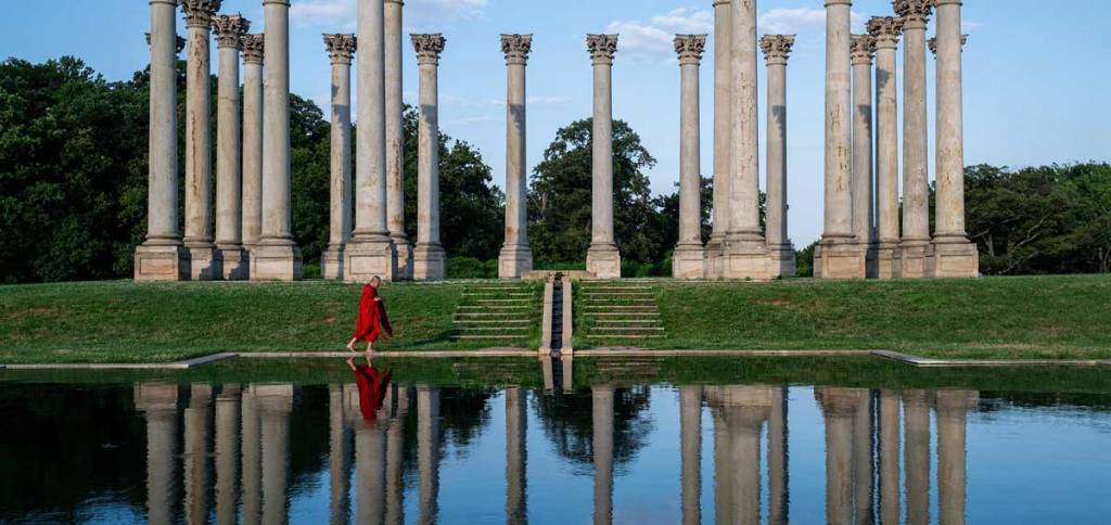The film has two components – a red robed monk takes very slow controlled steps in a succession of rural and urban landscapes and a young Asian man wanders wordlessly through some of the same spaces. At first, the rushing river and verdant forest seem like China or Vietnam or somewhere remote, but then we are watching the monk walk along the reflecting pool in Washington DC and through Union Station and the Smithsonian and we know we are in the US.